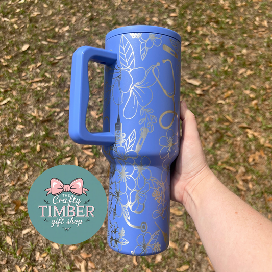 40oz Floral Nurse Tumbler with Handle - Laser Engraved Tumbler - Full Wrap Tumbler